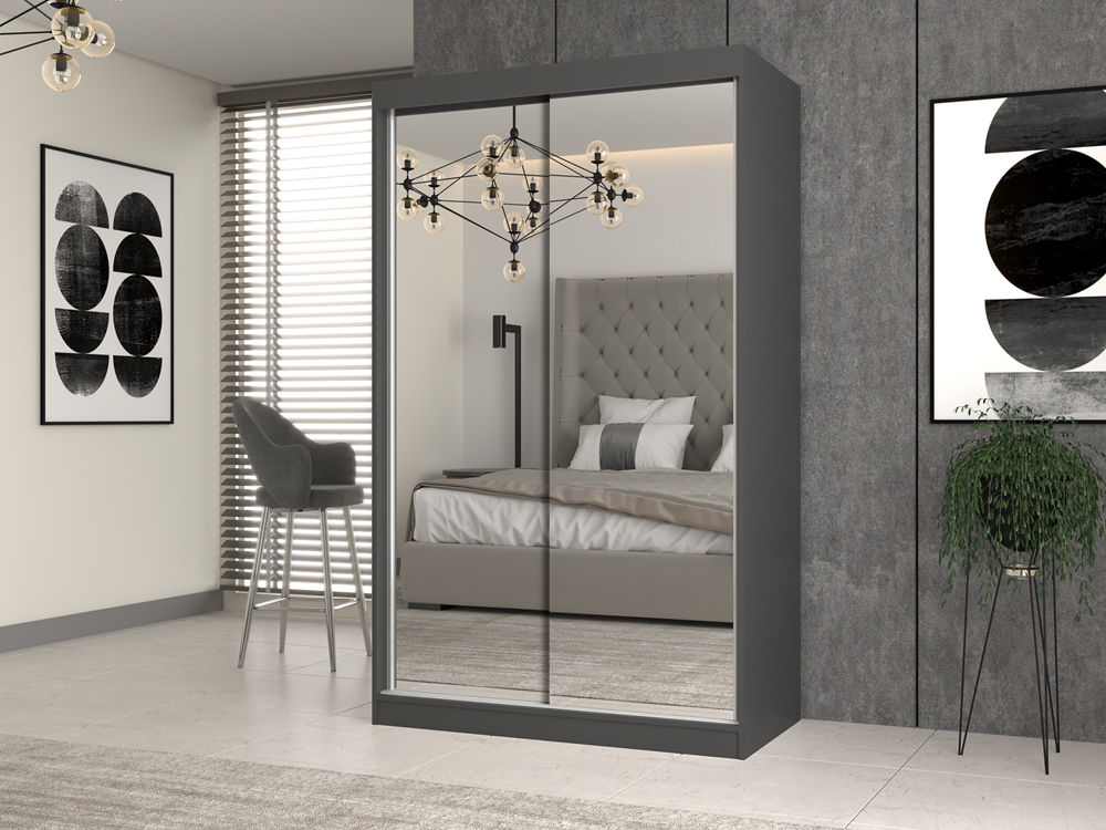 szafa z przesuwnymi drzwiami na których znajdują się 2 duże lustra -
