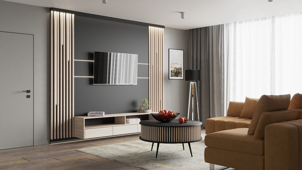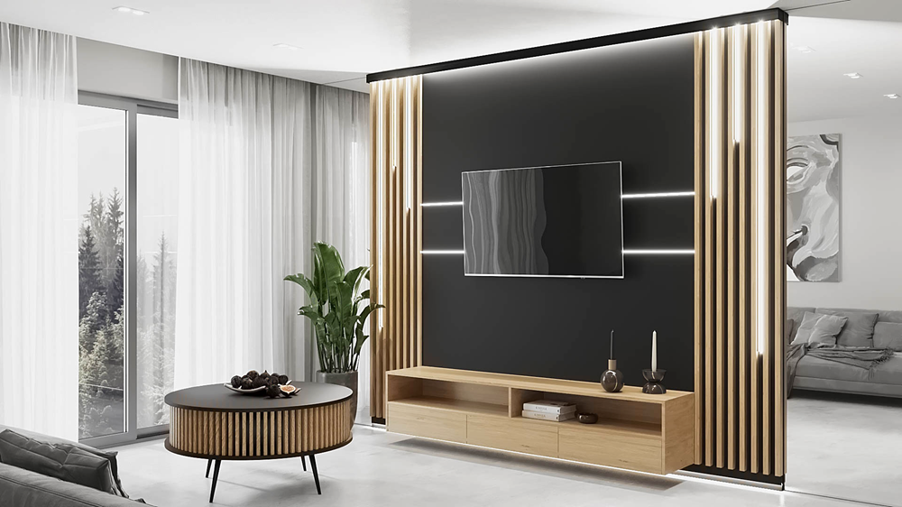 Nowoczesność - połączenie płyty meblowej z modnymi i popularnymi cienkimi lamelami -