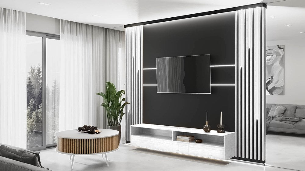 Nowoczesność - połączenie płyty meblowej z modnymi i popularnymi cienkimi lamelami -
